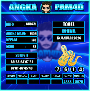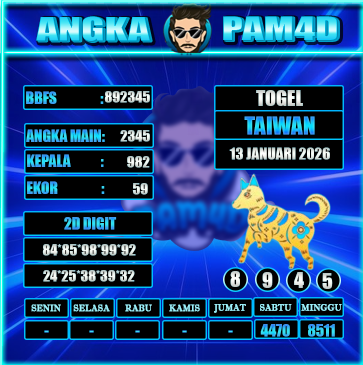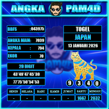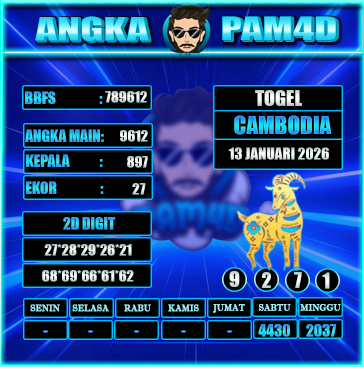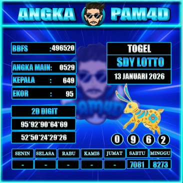 Prediksi togel PAM4D hari ini tanggal 13/01/2026 hadir untuk membantu pemain mendapatkan angka rekomendasi yang lebih akurat dan terarah. Setiap prediksi disusun berdasarkan pola data sebelumnya, analisa peluang, serta kombinasi angka yang sedang naik tren. Dengan pembaruan rutin setiap hari, pengguna bisa mendapatkan angka main, colok bebas, hingga kombinasi terbaik untuk berbagai pasaran populer.