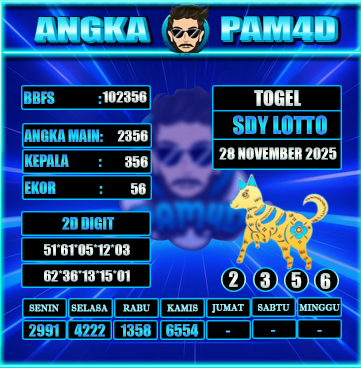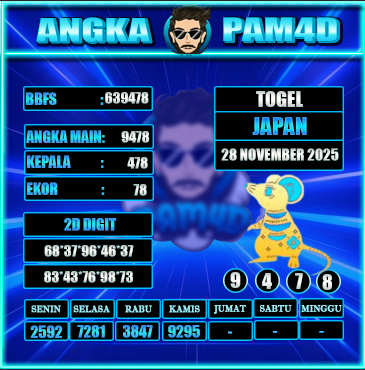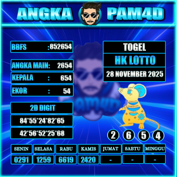Prediksi togel PAM4D hari ini tanggal 28/11/2025 hadir untuk membantu pemain mendapatkan angka rekomendasi yang lebih akurat dan terarah. Setiap prediksi disusun berdasarkan pola data sebelumnya, analisa peluang, serta kombinasi angka yang sedang naik tren. Dengan pembaruan rutin setiap hari, pengguna bisa mendapatkan angka main, colok bebas, hingga kombinasi terbaik untuk berbagai pasaran populer.